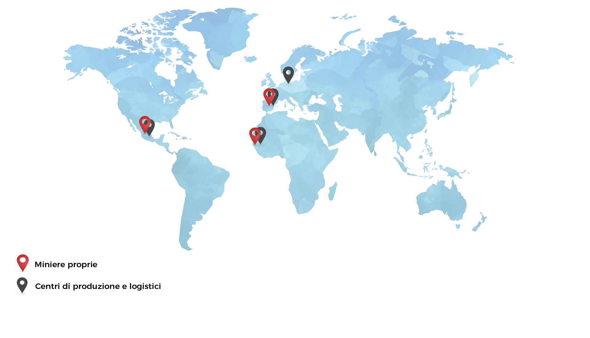 Abbiamo giacimenti minerari, centri di produzione e centri logisitici in 3 continenti.